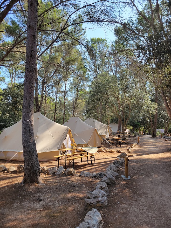 Some of my friends had gifted me 2 nights in a glamping with KAMPAOH. I saw they opened a new site in Menorca and decided to use my voucher there. Kampaoh puts their boujee tents on already existing campsites. There are beds, towels, sheets, a chair, a place to hang your clothes, so it’s for people who like camping, but don’t want to have to work for it. Ie: me.